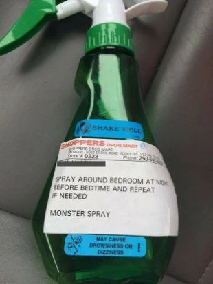 The photo of the ‘monster spray’ was posted on Reddit showing the bottle with custom made Shoppers Drug Mart stickers meant to help children fend off the scary creatures for a good night’s sleep.