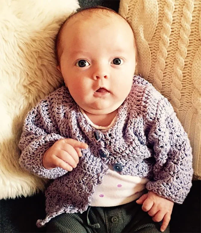 The two-month-old was photographed sitting on a couch and staying warm in a hand-stitched purple cardigan, polka-dot shirt, and dark green pants.